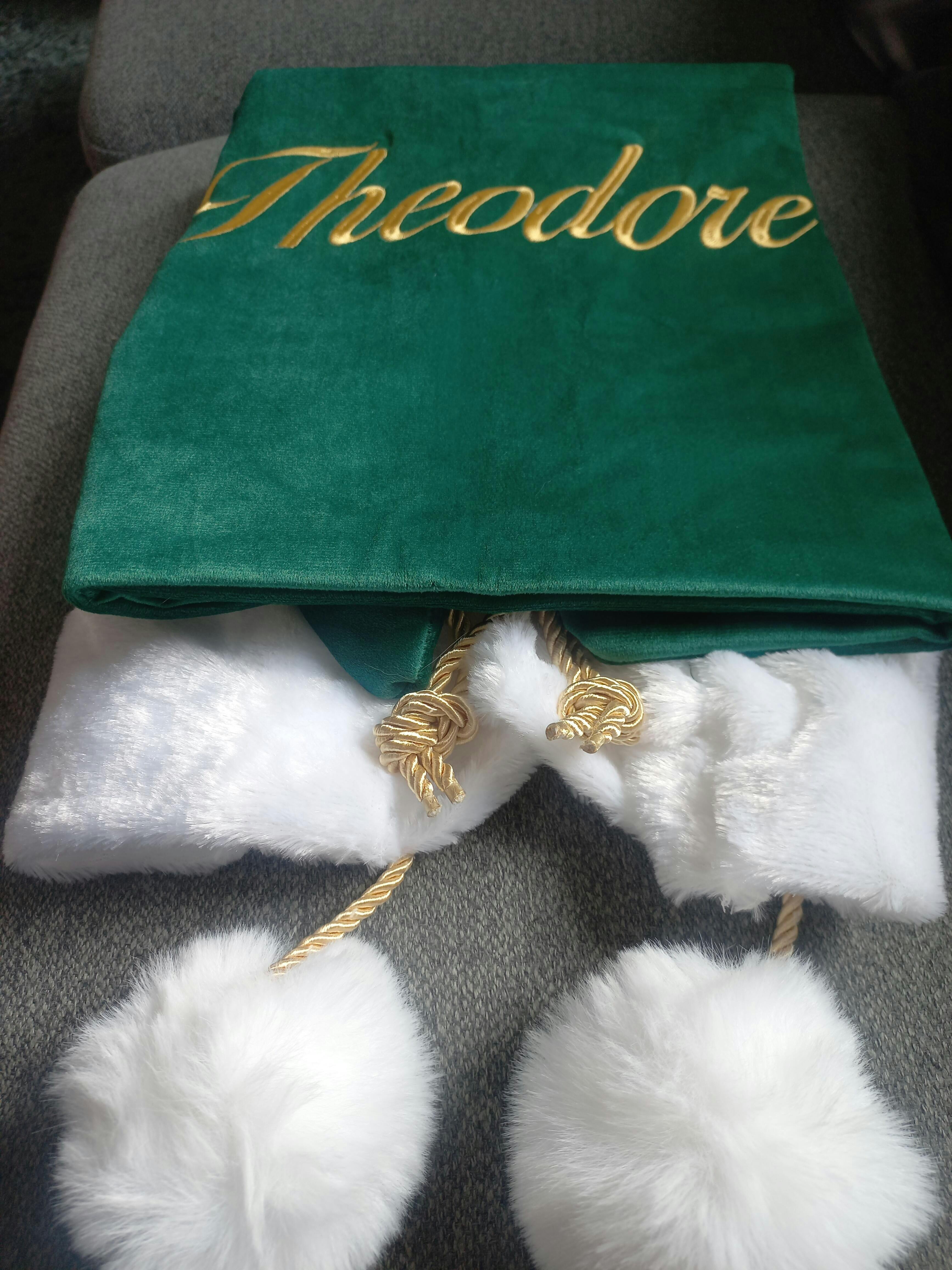 Crafted as a timeless keepsake, our generous 70cm tall x 50cm wide sacks feature a stunning white faux fur trim, golden rope, and delightful white fluffy pom-poms. Designed to become a treasured heirloom, they will be a cherished part of your family's Christmas traditions for years to come.
