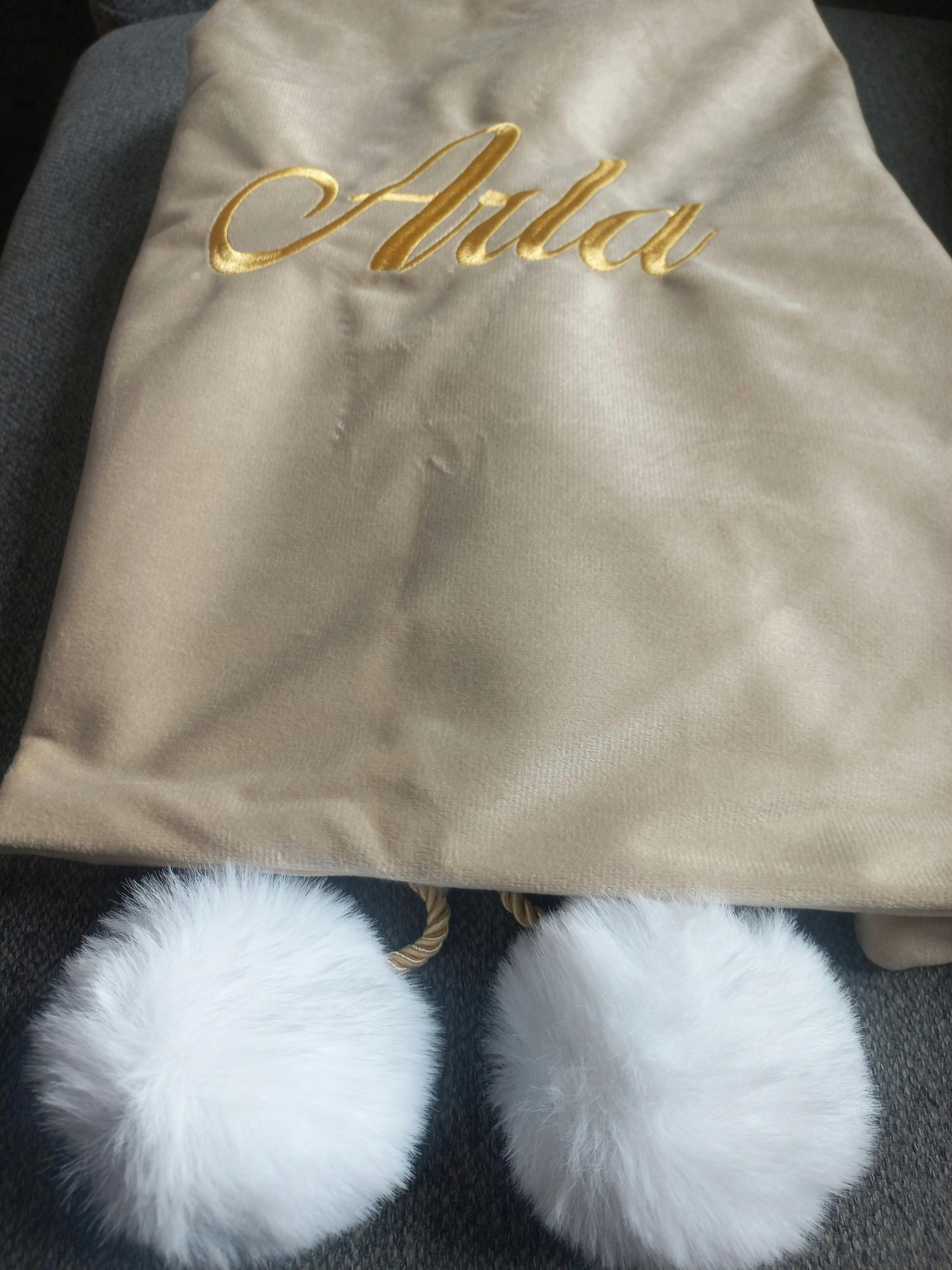 Each sack is made truly special by the addition of your chosen name, delicately embroidered in beautiful gold cotton by a local small business.